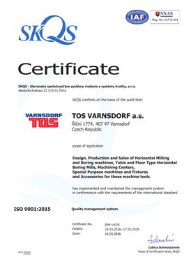 Wysoka jakość techniczna produktów TOS VARNSDORF a.s. została potwierdzona przez udzielenie w 1996 roku certyfikatu systemu zarządzania jakością zgodnego z normą ISO 9001.